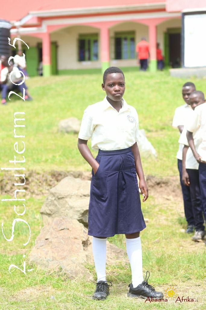 Die im Jahr 2011 geborene Caroline lernt seit dem Jahr 2022 an unserer Schule, zunächst ohne finanzielle Unterstützung. Sie wurde aufgrund ihrer Bedürftigkeit in unserer Patenschaftsprogramm aufgenommen und lebt seitdem im schuleigenen Internat (Boarding). Caroline lebt zusammen mit ihrer Mutter bei der Großmutter in einer Großfamilie, bestehend aus Tanten, Onkels, Cousins und Cousinen. Die älteren Familienmitglieder bauen Obst und Gemüse an. Der Ertrag reicht aber kaum aus, um alle zu ernähren. Ihr Vater unterstützt Caroline nicht. Die Aufnahme ins Boarding hat die Familie entlastet. Was ihre schulischen Leistungen angeht, muss man mit Caroline Geduld haben. Aktuell wiederholt sie die 4. Klasse und liegt im mittleren Leistungsbereich.